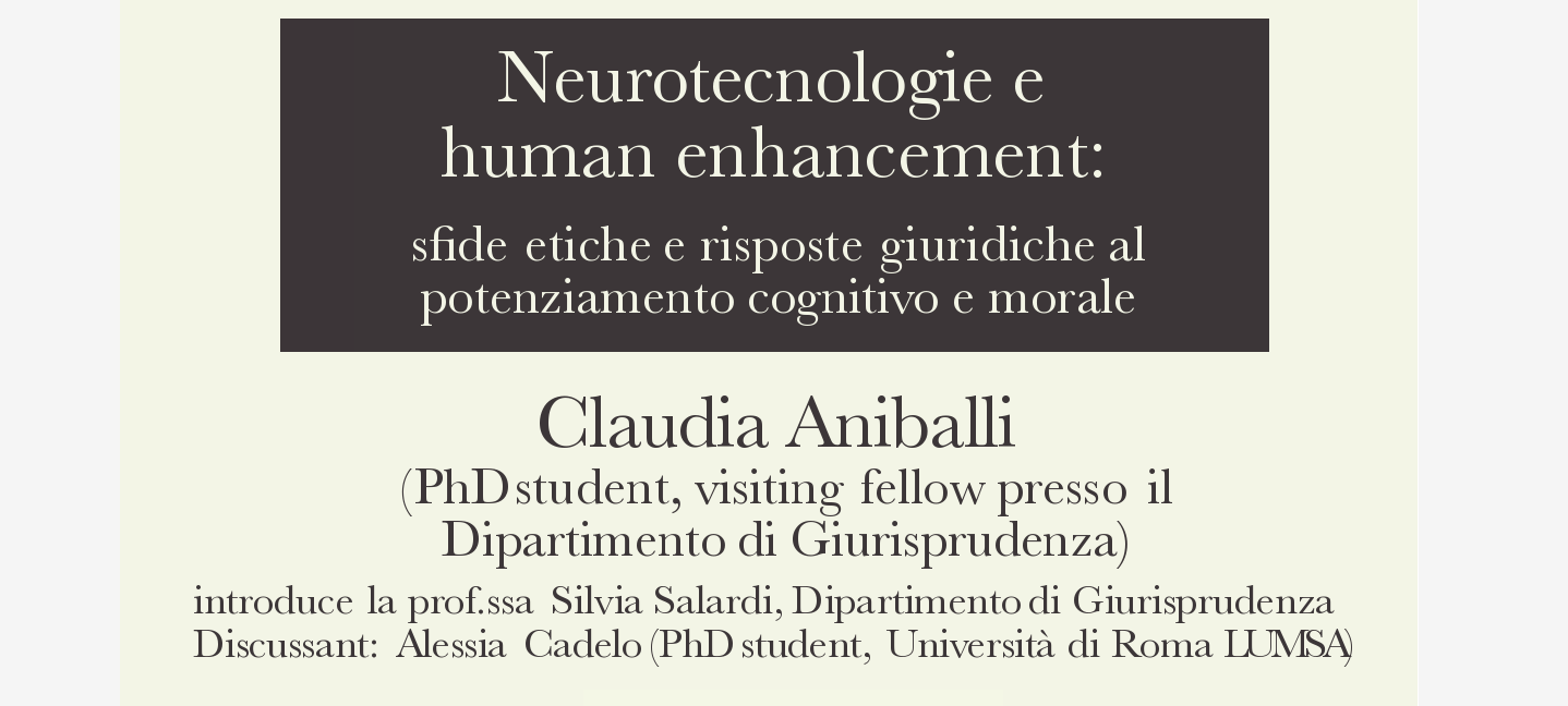 Il team del laboratorio TecSEDU è lieto di invitarvi alla presentazione della dott.ssa Claudia Aniballi, dottoranda presso l’Università Carlos III Madrid e, visiting scholar presso il nostro Dipartimento. La dott.ssa Aniballi presenterà il suo progetto di ricerca dal titolo Neurotecnologie e Human Enhancement: sfide etiche e risposte giuridiche al potenziamento cognitivo e morale.
